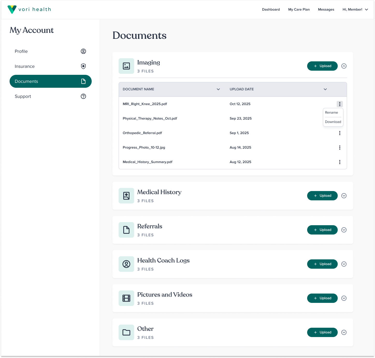 The Document Center in the patient portal allows members to both upload documents to share with their care team (medical records, imaging, etc) and receive/download documents sent to them by their care team.
